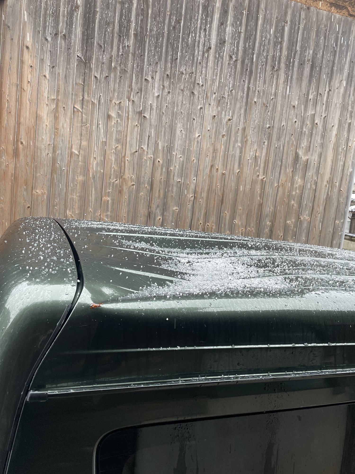 帰宅し玄関を入ろうとした時、異変に気がついた。なんと家の屋根から落ちた雪が、バンの屋根に強く落ちた様子で大きく凹んでいる。あれまぁ。。。。